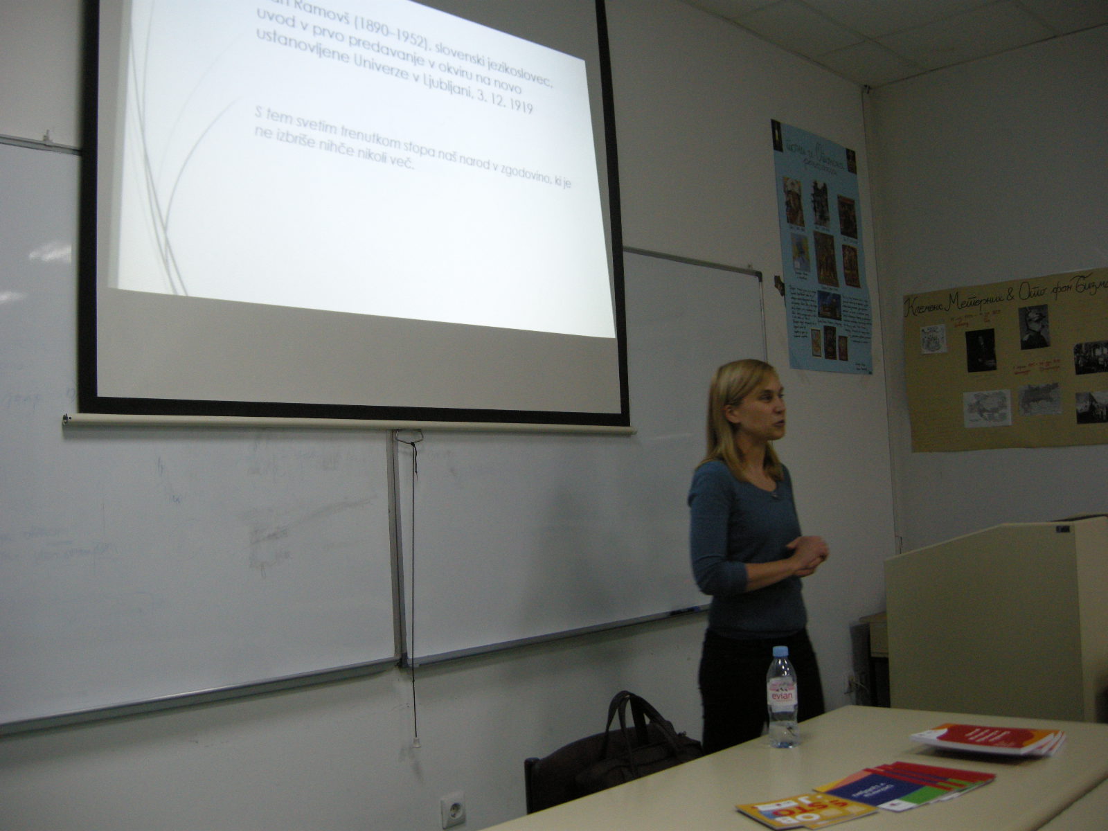 Stoletnico prve slovenske univerze smo 5. decembra obeležili tudi v Banjaluki. Na Filološki fakulteti je lektorica dr. Janja Vollmaier Lubej pripravila predavanje o slovenskih znanstvenicah in umetnicah z začetka 20. stoletja. Odličnega predavanja so se udeležili tudi učenci dopolnilnega pouka slovenščine in člani Društva Slovencev Triglav. Skupaj s študenti so povsem napolnili predavalnico in z zanimanjem prisluhnili predavanju o Almi Karlin, Vidi Jeraj, Zofki Kveder, Angeli Piskernik, Lili Novy, Almi Sodnik, Ilki Vašte, Meti Vidmar, Marji Borštnik, Ljubi Prenner, Zdenki Adamič, Miri Mihelič, Branislavi Sušnik in drugih znanstvenicah in umetnicah, ki so vsaka po svoje zaznamovale čas, v katerem so živele, in pomembno vplivale na razvoj slovenske znanosti in umetnosti. Po predavanju je bil čas za druženje. Bilo je sladko, saj nas je dr. Janja Vollmaier Lubej pogostila s potico.
