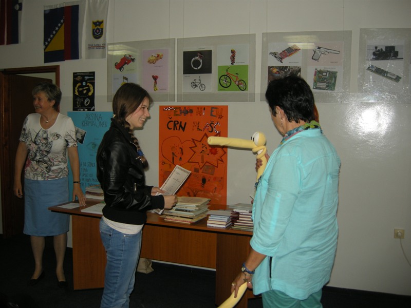 Školska godina je završila. U srijedu, 18. juna, podijelili smo potvrde za pohađanje nastave i priznanja Bralne značke Slovenije. Posjetili su nas slovenački pisac Aksinja Kermauner i direktorica Biblioteke Antona Tomaža Linharta Radovljica Božena Kolman Finžgar.