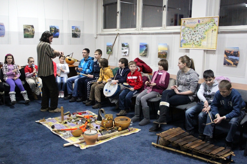 Učenici su se u petak i subotu, 10. i 11. februara, upoznali sa slovenačkom narodnom muzikom i narodnim instrumentima iz čitavog svijeta. Ukratko je predstavljena narodna muzika gdje se snažno prepliću tekst i melodija i za koju je karakteristično da se prenosi pjevanjem i to na više načina. Pjesmom su obišli slovenačke pokrajine i predstavili veći broj narodnih instrumenata: lonac bas, pjevajući češalj, drumlu, trstike, čivink, bisernicu … Pošto Mateja i Samo mnogo putuju i istražuju narodnu muziku po čitavom svijetu, prikazali su nam razne instrumente. Vidjeli smo i indijsku sarangu i dotaru, mađarski hurdy gurdy, afrički kalimbo, arapsku lutnju, marokanski bendir i n'goni – »harfu« iz Malija. Vidjeli smo također različita zvona i udaraljke, koje su učesnici radionice sa zadovoljstvom isprobali, tako da je u prostorijama društva dva dana bilo jako bučno. Učenici su bili jako aktivni, pa su i sami izradili pištaljke od električnih cijevi, pištaljke kazu od bambusa i klarinet od slamke.