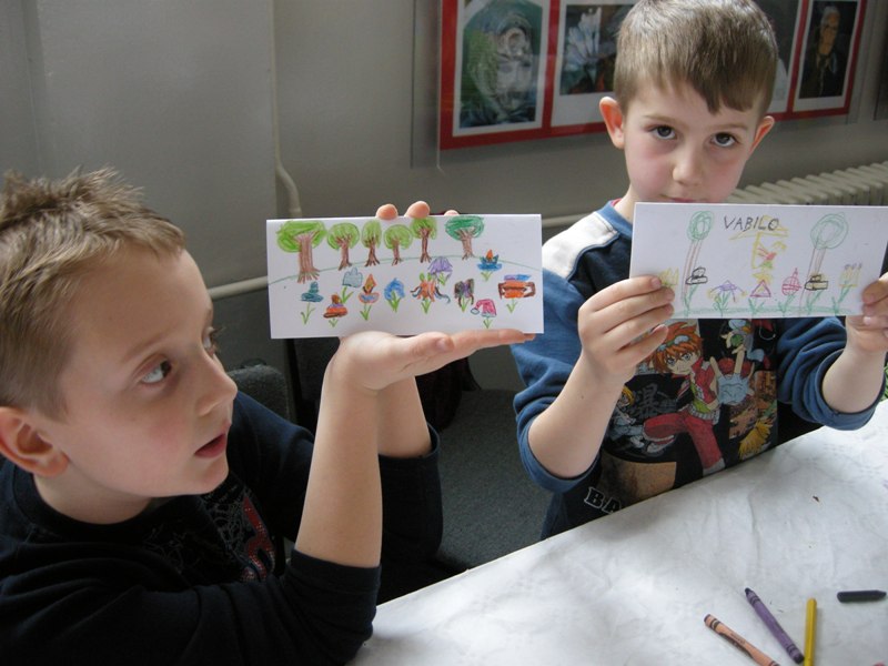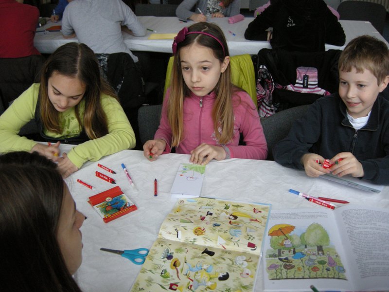 U radionici koju su vodile Aleksandra i Marina, djeca su bojila jaja – ne ona prava već ona od papira, nalijepili su ih na karton, tako da su nastali lijepi plakati. Franci je učesnike radionice naučio kako mogu od tijesta oblikovati zečeve i peretke, a pod spretnim dječijim prstima su nastale i ribe. Sve su to onda ispekli i neki od njih su svoje umjetničke radove odmah pojeli. U četvrtoj radionici smo pravili pozivnice za predstavu »Moj kišobran može biti i balon«.  Predstavu će pripremiti učenici dopunske nastave slovenačkog jezika pod vođstvom lutkara Jelene Sitar i Igora Cvetka. Već sada vas pozivamo da 12. maja zajedno sa nama odletite u državu Šeširdžija. Predstava će se održati u pozorištu »Jazavac« u 11.00.