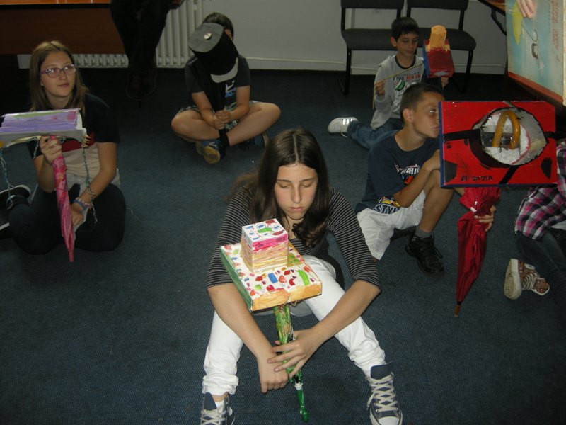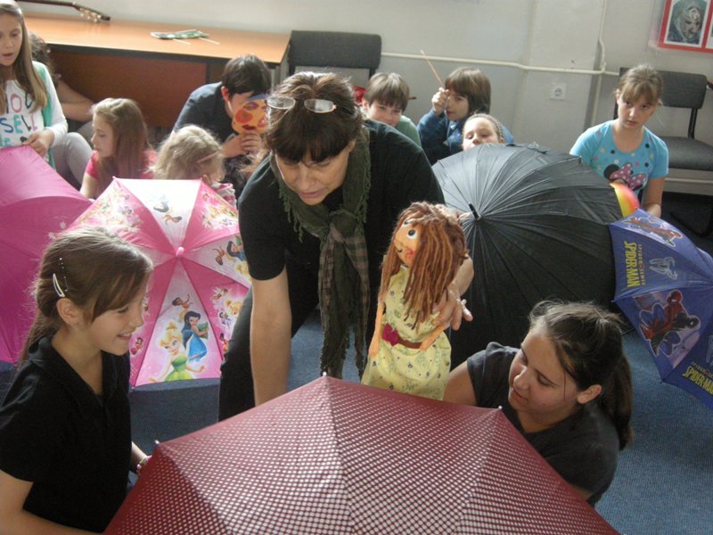 U petak su cijeli dan pravili maske i lutke, u subotu su razdijelili uloge i vježbali, u nedjelju su već pokazali rezultate svog rada. Nastala je predstava „Moj kišobran može biti i balon“, a djeca su je odigrala pred punom dvoranom pozorišta Jazavac. Bajka Ele Peroci nas je povela u zemlju Klobučariju. Nastupalo je više od tridesetoro djece, a predstavu je pratila muzika – čuli su se zvuci harmonike, gitare i violine. Fotografije govore više nego riječi, mada je teško opisati šta sve su morala djeca napraviti i naučiti da bi mogli odigrati predstavu.