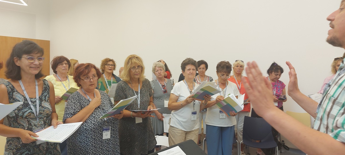 Ujutro smo u muzičkoj školi “Isidor Bajić” upoznali ljubazne domaćine, koji su nam dali akreditacije i uputili nas na radionicu A1 sa tamburašima. Dočekao nas je dirigent iz Sombora Milan Radišić. Uslijedilo je kratko upoznavanje i razigrani horovođa, mladi Somborac započeo je probu tako što smo jedni druge ukrug kratko masirali, uz puno smijeha i šaljivih komentara. A zatim je uslijedilo upjevavanje. Svima nam je godila masaža pa smo predložili Vanji da i mi uvedemo masaže na naše probe. Na našoj radionici su bili pjevači iz Plovdiva iz Bugarske, pjevačica iz Ljubljane, pjevači iz Poljske i nekoliko pjevača iz Novog Sada. Lijepo društvance se savršeno popunilo kad nam se je, kao pjevačica pridružila i naša dirigentica Vanja. Tako da smo sa njom pjevali zajedno kao nekad kad je došla da pjeva u slovenački hor.