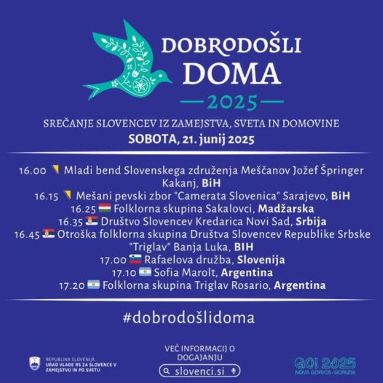 Manifestacija „Dobrodošli doma“ je susret Slovenaca i njihovih potomaka koji žive i rade izvan Slovenije a koji svake godine u junu tradicionalno organizuje Republika Slovenija. Naše udruženje sa ponosom svake godine učestvuje na ovoj manifestaciji čiji centralni događaj je ovaj put održan 22.06.2025. godine u Novoj Gorici.