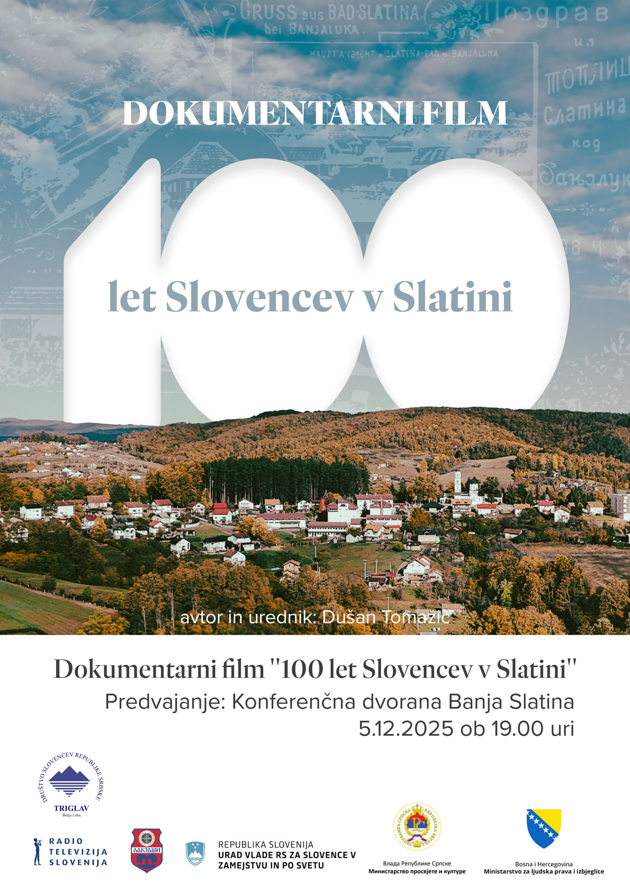 U petak, 5.12.2025. godine, sa početkom u 19.00 časova, u Kongresnoj sali Banje Slatina premijerno je prikazan dokumentarni film “100 godina Slovenaca u Slatini” autora Dušana Tomažiča koji prati priču doseljavanja slovenačkih porodica na ovo područje.