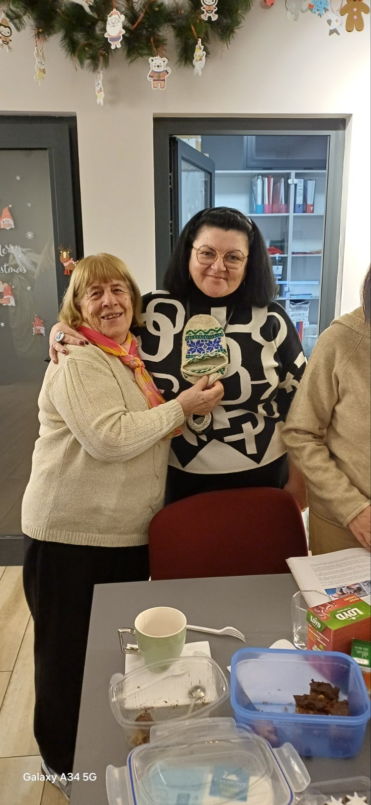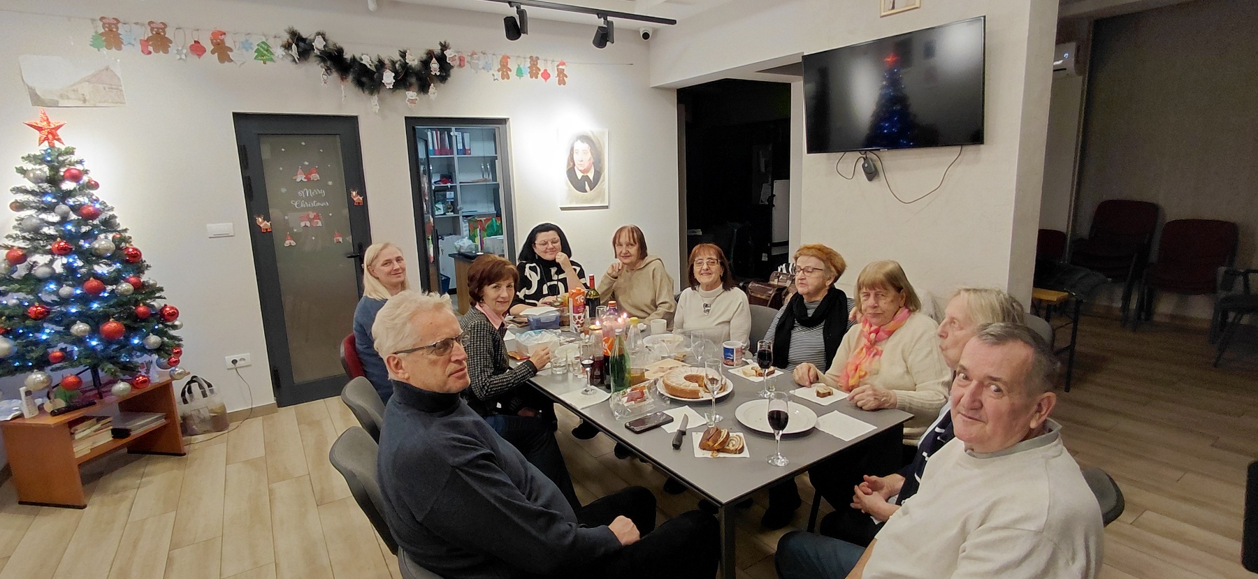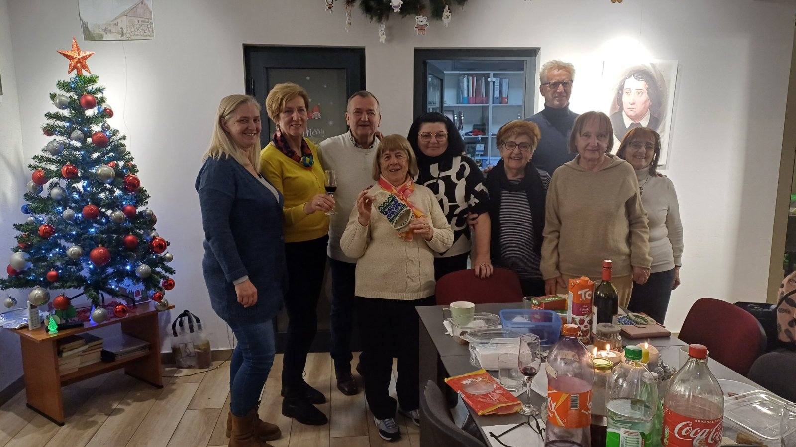 Metoda je uz pomoć mlađih učenika okitila i uredila učionicu, tako kad smo došli na čas, atmosfera je bila prijatna praznična. I mi smo donijeli neke božićne poslastice i vino i zabavljali smo se razgovarajući uz zvuke slovenačke pop muzike. Svi su imali pravo na jednu muzičku želju. Kao vrhunac te prijatne večeri, desilo se nešto što niko nije očekivao, posjetio nas je Božiček! Bili smo baš iznenađeni, ali i sretni jer nas je to za trenutak vratilo u naše djetinjstvo. Uzeli smo poklone i to smo, naravno, ovjekovječili sa jednom fotografijom. Našu dragu vrijednu učiteljicu nije zaboravio Božiček i donio joj je lijepo ukrašene, ručno izrađene, vunene priglavke. Ho Ho Ho