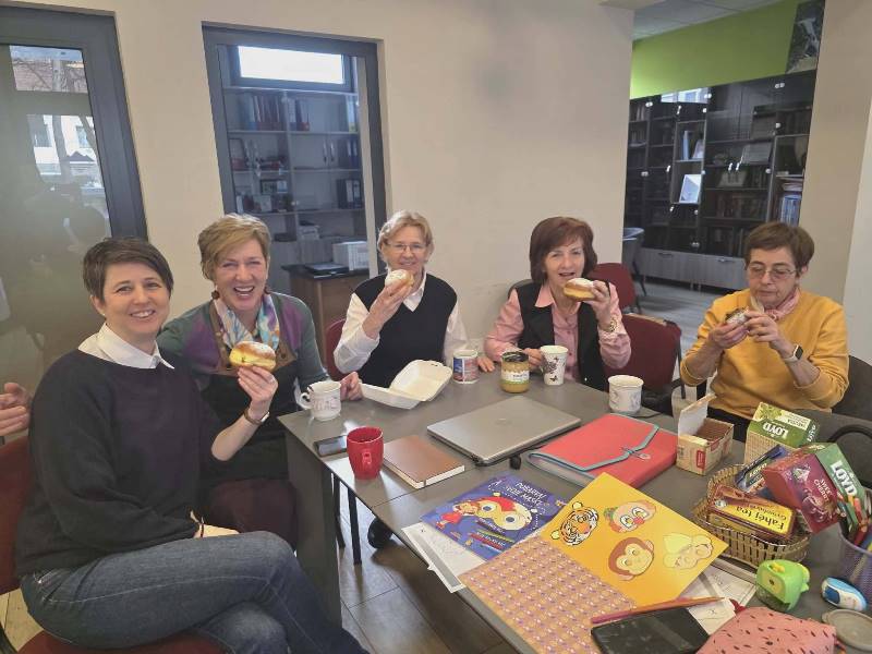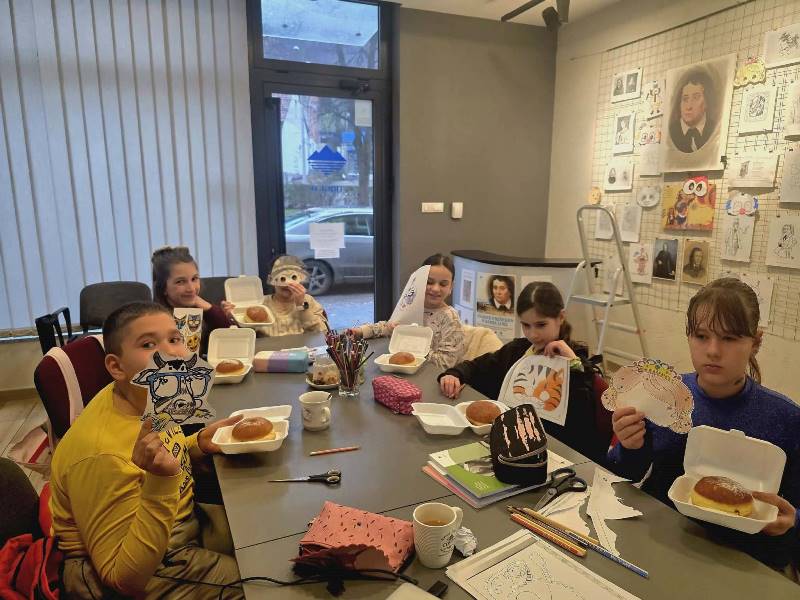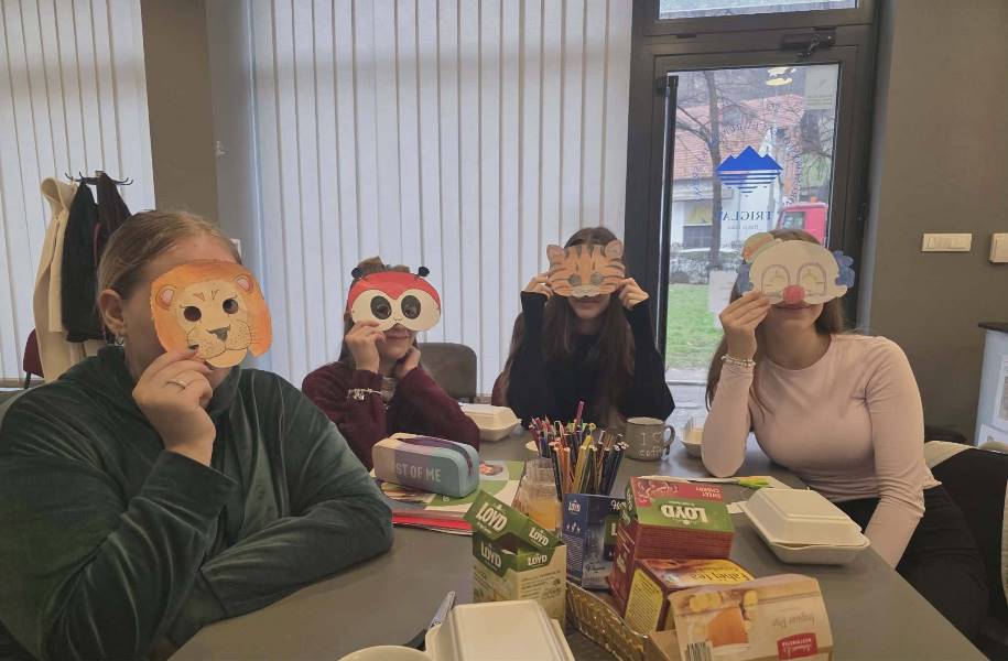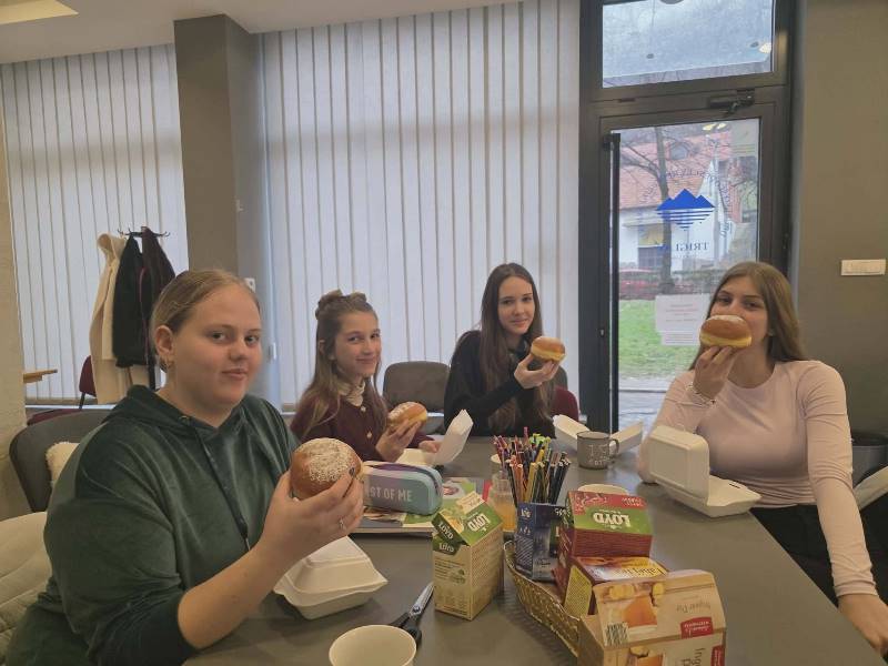 Svaki učenik je zatim oslikao jedan od karnevalskih predložaka i pričvrstio svoj proizvod na zidni pano, koji već neko vrijeme krasi prostorije Udruženja “Triglav”. Na kraju subotnjih druženja uživali smo u velikim i izuzetno ukusnim krofnama. Djelić naše karnevalske atmosfere podijelili su i vrijedni članovi Udruženja, koji su pripremili ukusne zalogaje za izbornu skupštinu Udruženja “Triglav”, koja se također održala 14.2.2026. godine. Također su uživali u krofnama i ljubazno pozirali za grupnu fotografiju.