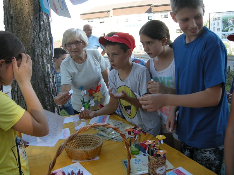 Učenici su učestvovali i na štandu. Predstavljali su predmete, koji su nastali u okviru projekta Sve najbolje, Slovenija. Slike, narukvice i cvijeće, koje smo napravili na kreativnim radionicama, poslali smo u različite države, a naš štand su krasile zastave i cvijeće, koje su napravili naši vršnjaci iz cijelog svijeta. Među predmetima je bio i crveni autobus, koji smo dobili iz Londona. Za posjetioce smo pripremili kviz Šta znaš o Sloveniji? Zanimanje za traženje odgovora na pitanja je bilo veliko, pa smo tako kvizom pomogli širenju znanja o zemlji naših predaka.
