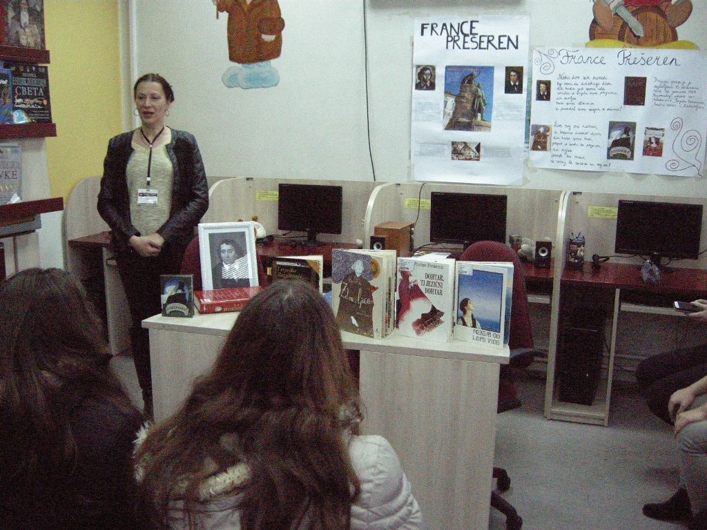 Februar je mjesec kulture, te smo zato odlučili da govorimo o Francu Prešernu. U petak, 23. februara, su u bibliotkeu došli učenici 9. razreda Osnovne škole Branko Ćopić. Učenike su pozdravili Aleksandra Čvorović i predstavnica Udruženja Slovenaca Triglav Marija Petković. O Prešernovom životu je govorila Iva Potkonjak, a njegov rad je predstavila Aleksandra Špehar. Barbara Hanuš je pročitala pjesmu Zdravljica na slovenačkom jeziku, a Aleksandra Špehar prevod pjesme na srpskom jeziku. Učenici su dobili radni list i pokazalo se da nisu imali problema pri rješavanju. Postavili smo im i nekoliko pitanja i brzo smo čuli pravilne odgovore. Njihovo razumijevanje slovenačkog jezika smo provjerili tako da su nakon slušanja pjesme Povodni mož ispričali priču Urške i podvodnog čovjeka. Da li je Urška preživjela? Gdje je živjela sa podvodnim čovjekom? Sve to smo izveli u zadnjem dijelu časa kada su učenici rekli kako zamišljaju nastavak pjesme. Nasmijali smo se njihovim originalnim zamislima.