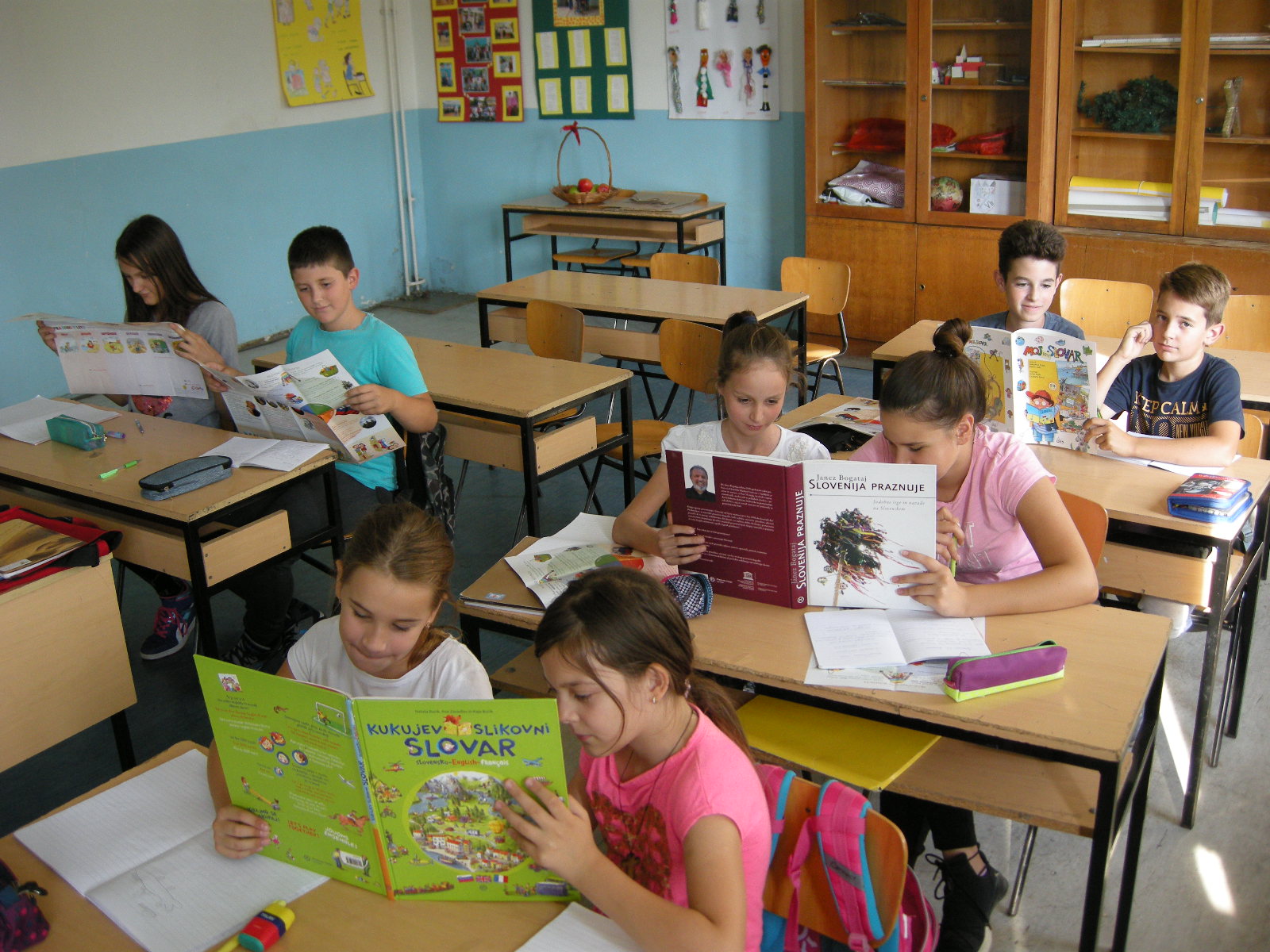 Ove godine se obilježava Evropska godina kulturnog nasljeđa, zato smo čitanje povezali sa upoznavanjem znamenitosti Slovenije; naše teme su bile hrana, slovenački gradovi i praznici. S obzirom da je 2018. godina Cankareva godina, nismo zaboravili na velikana slovenačke riječi. Pročitali smo njegovu priču Pehar suhih krušaka. Uz upoznavanje tradicionalne slovenačke hrane smo hranu, koja je značajna za pojedinačne krajeve, upisali na kartu. Karte smo dopunili i opisom gradova te običaja. U knjigama Irene Cerar Putevi bajki Slovenije smo potražili priče, koje se događaju na tvrđavama. U obogaćivanju znanja o praznicima su nam pomogli knjige Slovenija praznuje Janeza Bogataja i Na praznike miriše Slavke Ilich. Mnogo zanimljivih informacija smo našli i u revijama i turističkim prospektima. Osnovci će znanje o slovenačkim praznicima pokazati na kvizu, koji organizujemo 20. oktobra u Banjaluci.