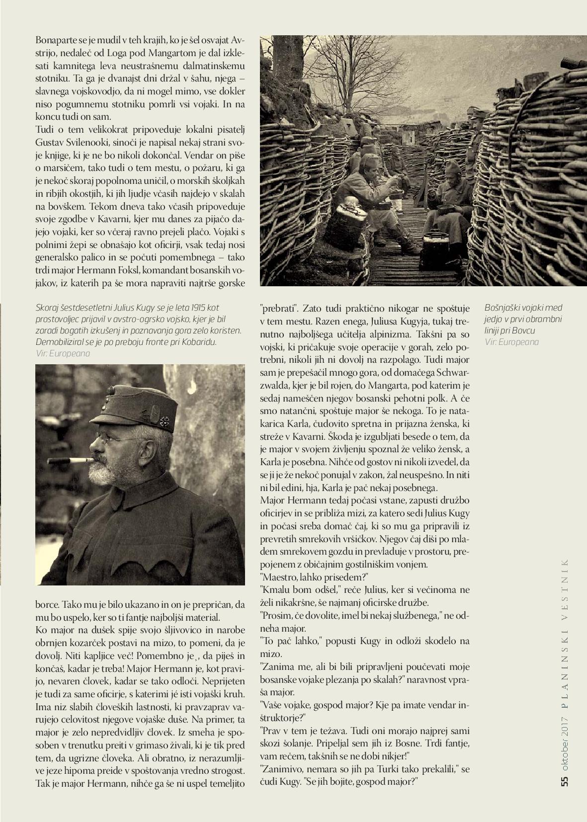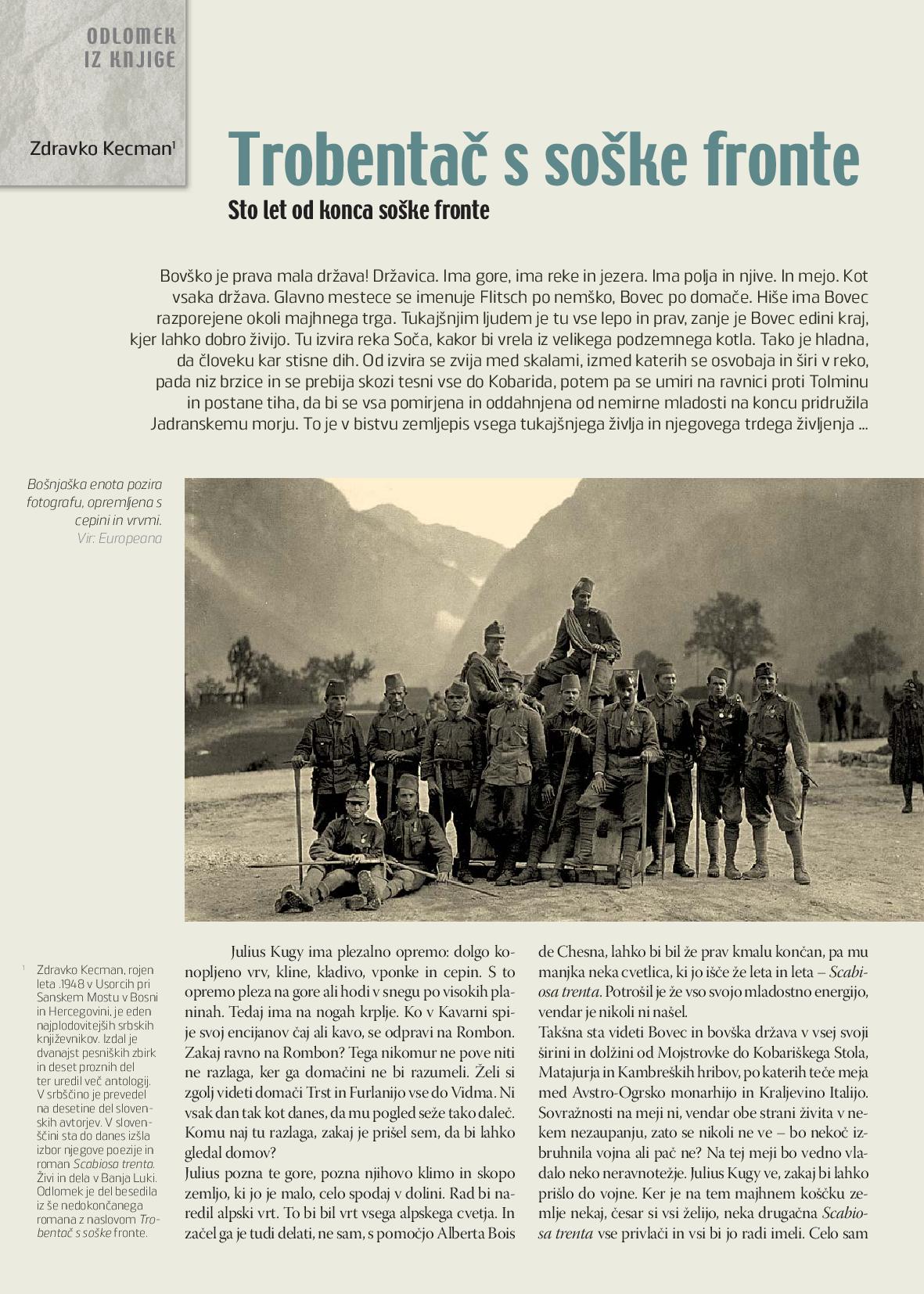 - Roman sam počeo „upoznavati“ u svojim mladim godinama, ne samo spisateljskim već i životnim dok sam živio na tome području Soče, Pjave, Julijskih alpa. Ali priča je mnogo složenija i opširnija, mnogo slojevitija, u nju su utkani mnogi likovi i njihovi životi. Imao sam građu kakvu niko možda nije imao, ona je godinama taložena, fermentirala tako da se se stvorila potrebna distanca od svake arhivske „zaparaloženosti i dosade“, pa se tok romana odvijao u skladu sa klasičnim konceptom: početka – i kraja. Posebno su zanimljivi razni likovi, od onih domaćih, usorački, podgrmečkih i potkozarskih do sasvim drugih i drugačijih iz raznih zemalja, a koje sam lično ili posredno upoznao. Naime, gore gdje sam bio, susretao sam mnoge aktere tih ratnih događaja, bili su to oficiri i soldati koji su svake godine dolazili da obiđu mjesta na kojima su ratovali i nekim čudom ostali živi. Među njima mnogi iz naših krajeva, sela i gradova. Ti junaci su mi se uselili u život da sam sa njima, svakodnevno se družio, vodio razgovore, oni su me budili noću, nisu dali da spavam, često su mi predlagali razne stvari i ideje u romanu pa sam imao više rješenja za koja sam morao da se odlučim. Veoma sam im zahvalan za te besane noći, skoro desetogodišnjeg pisanja romana. Bilo je tu i nevjerovatnih scena, da, kroz proces pisanja romana.