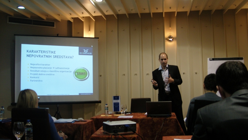 Praktičnu radionicu vodio je mr Damjan Struna, savjetnik za nepovratna sredstva u RR & CO. Knowledge Centre Ltd. koji ima višegodišnja iskustva na području pripreme i pisanja projekata, pripreme članaka i predavanja na seminarima i radionicama u oblasti dobivanja i korištenja nepovratnih sredstava EU, te administrativno-finansijskog vođenja projekata, finansiranih od strane nepovratnih sredstava Evropske unije.