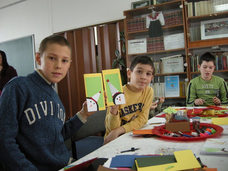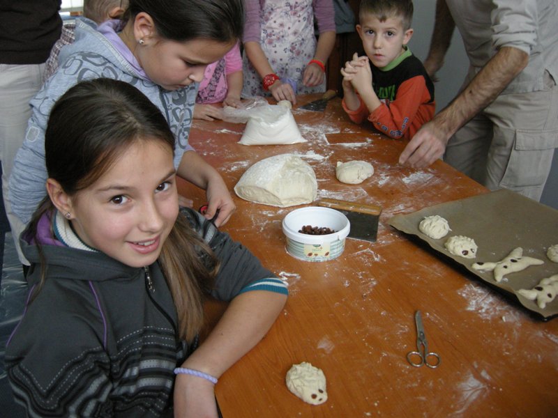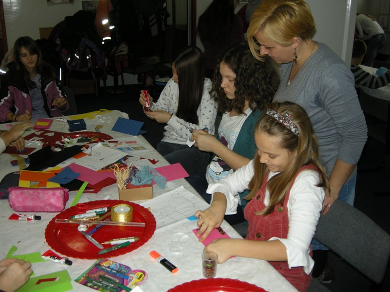 Pod spretnim dječijim prstima su nastajale lijepe čestitke, učenici dopunske nastave slovenačkog jezika su bojili čaše i crtali slova na drvenim tablama. U Udruženju smo imali i šporet pa su se djeca učila mijesiti i oblikovati tijesto. Sveti Nikola već dolazi, zato su od tijesta napravili njegove pratioce - đavolke. Oblikovali su i ježeve i pletenice. Sve su naravno ispekli i nešto proizvoda odmah pojeli. Druge su ponijeli kući, a nešto čaša, čestitki i slova ukrašava prostorije Udruženja.